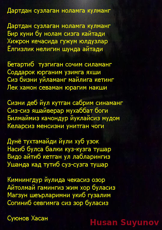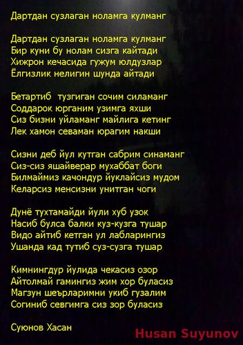 Хасан Суюнов - Дард Хасан Суюнов HUSANCHIK 10.02.2023, 19:05 308 0 Хасан Суюнов Ctrl Enter Заметили ошЫбку Выделите текст и нажмите Ctrl+Enter Комментарии (0) Мы в Ютубе Нравится 0 Не нравится 0 Войдите: Отправить Читайте также Хасан Суюнов - Мусофирлик Хасан Суюнов - Жимлигимча Хасан Суюнов Хасан Суюнов - Бахтин топган ошиклар Хасан Суюнов - Эй мени ахтариб Келган шамолар Хасан Суюнов - Дард Хасан Суюнов - Албатта бу хаммага эмас Хасан Суюнов - Бегонаман Хасан Суюнов - Бугун Сени гулим ёмон согиндим Топ из этой категории Севгимизни хотирлаб 18.08.2023, 23:31 476 0 Хасан ва Хусан - Попури 18.02.2023, 00:01 639 0